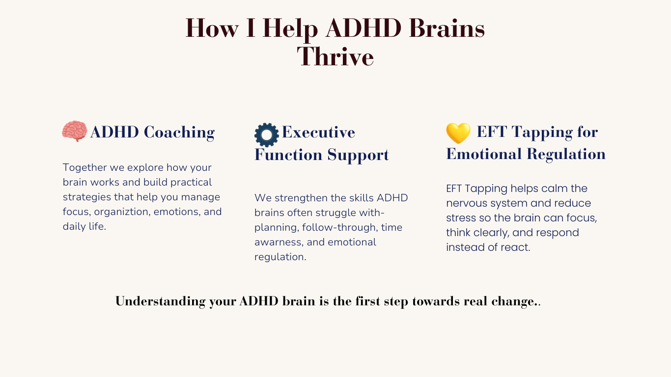 I’m also a Certified ADHD Parent Coach and an EFT Tapping Practitioner, combining practical ADHD strategies with tools that help regulate emotions and reduce stress.