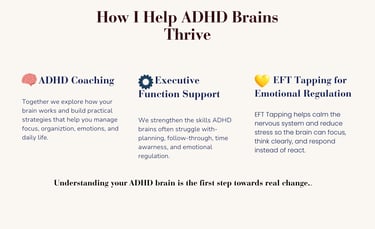 In my coaching, I focus on helping people understand how their ADHD brain works so they can build strategies that support their daily life.